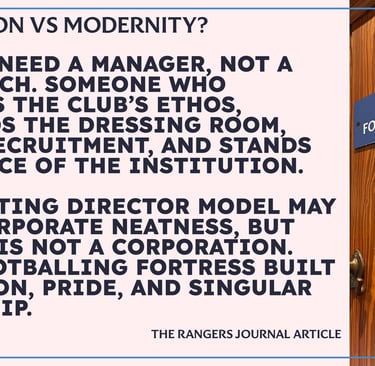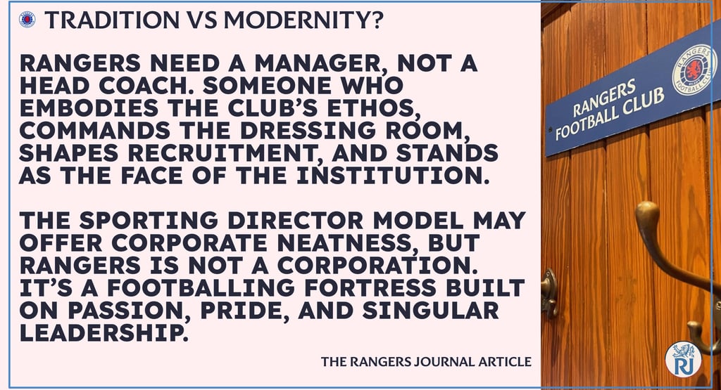 Rangers need a Manager, not a Head Coach. Someone who embodies the club’s ethos, commands the dressing room, shapes recruitment, and stands as the face of the institution. The Sporting Director model may offer corporate neatness, but Rangers is not a corporation—it’s a footballing fortress built on passion, pride, and singular leadership.